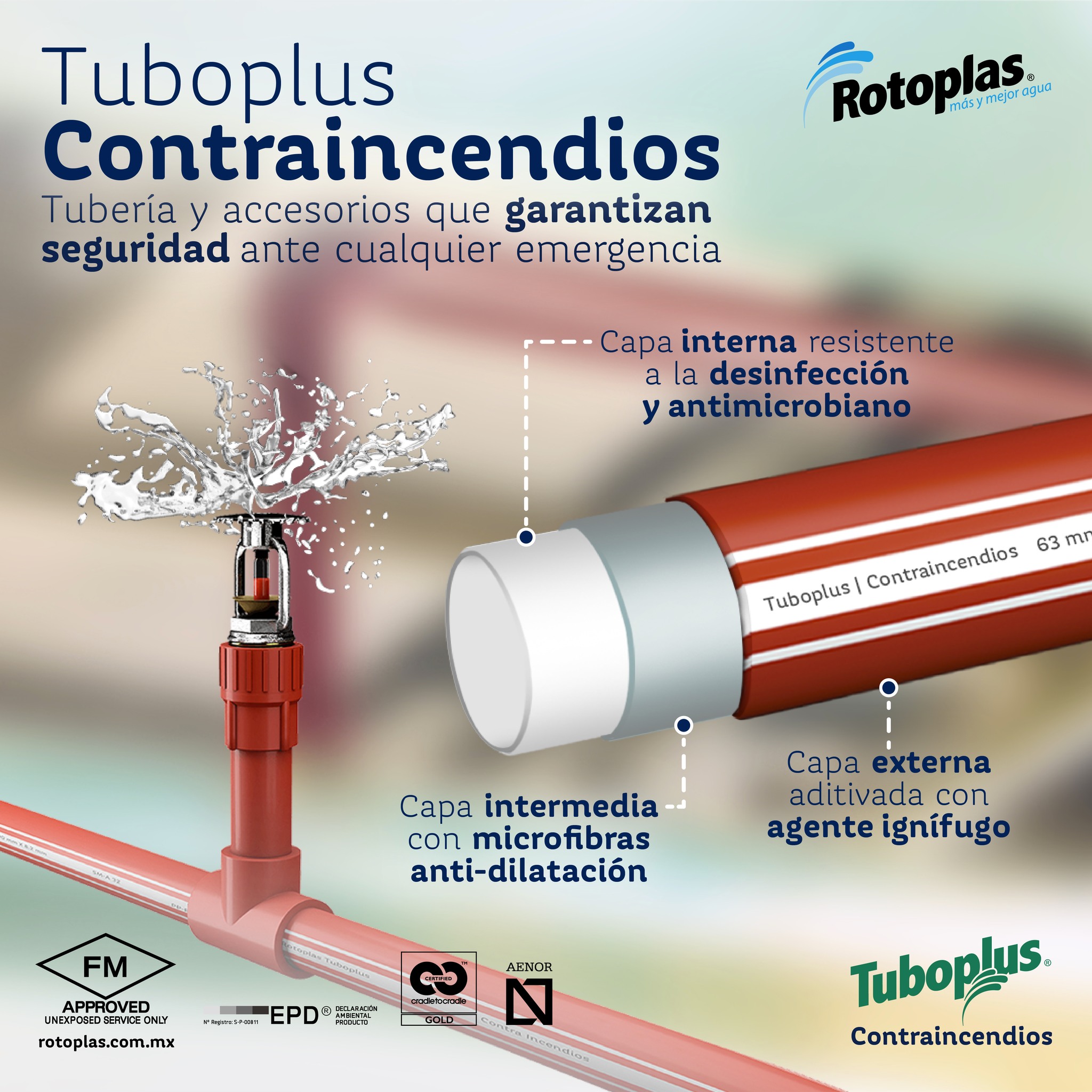 Tuboplus Contraincendios es un sistema avanzado de tuberías y accesorios fabricado en polipropileno multicapa PPR-CT RP+FV (con fibra de vidrio). Su diseño innovador y su resistencia al fuego lo convierten en la mejor solución para redes de protección contra incendios.