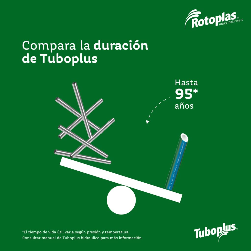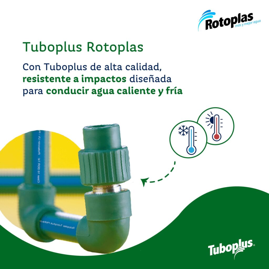 Tuboplus Hidráulico (PP-R) es un sistema integral de tuberías y conexiones de Rotoplas, diseñado para la conducción de agua a altas presiones y temperaturas extremas. Fabricado con Polipropileno Copolímero Random (PP-R), un material innovador desarrollado en Alemania, garantiza máxima resistencia, durabilidad y seguridad en cualquier instalación hidráulica.