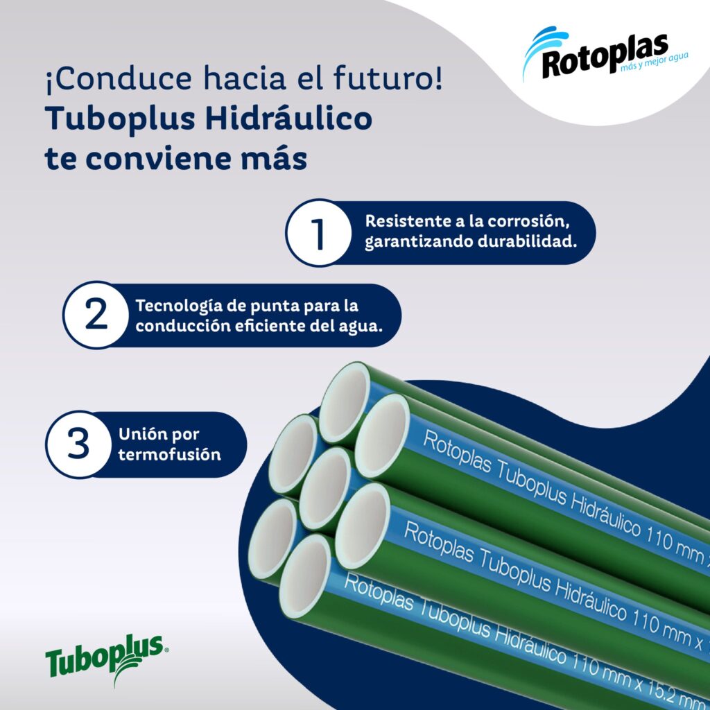 Tuboplus Hidráulico (PP-R) de Rotoplas es un sistema de tuberías de alta tecnología fabricado en Polipropileno Copolímero Random (PP-R), ideal para la conducción de agua a altas presiones y temperaturas extremas. Su diseño garantiza durabilidad, resistencia y seguridad en instalaciones residenciales, comerciales e industriales.